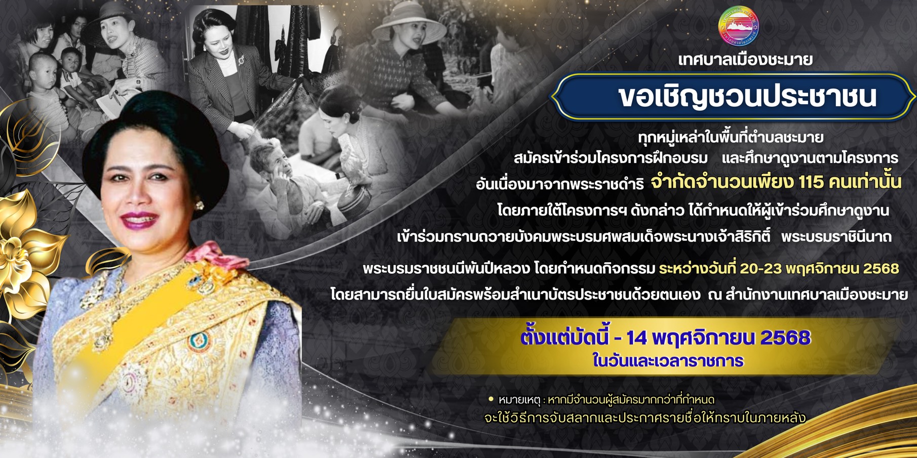 ขอเชิญชวนประชาชนทุกหมู่เหล่าในพื้นที่ตำบลชะมาย สมัครเข้าร่วมโครงการฝึกอบรมและศึกษาดูงานตามโครงการอันเนื่องมาจากพระราชดำริ |