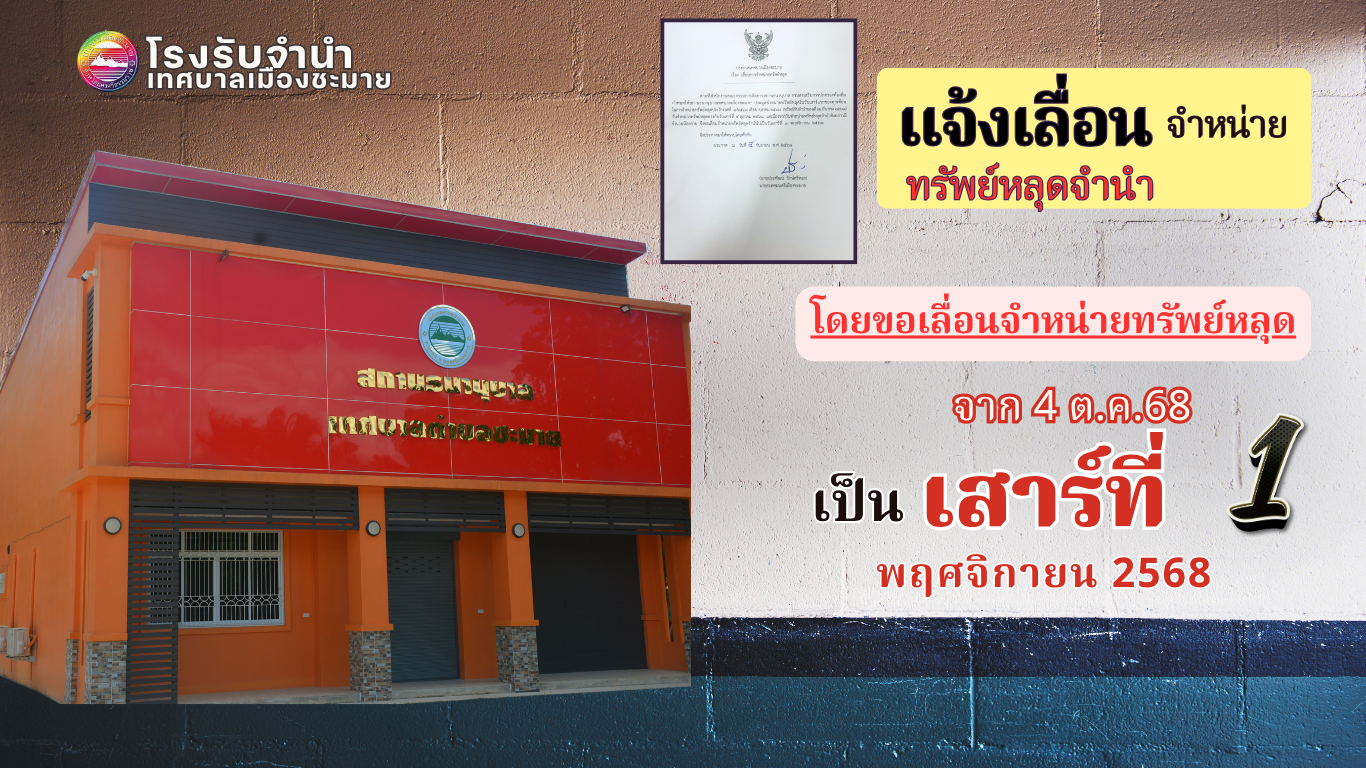 ประกาศแจ้งเลื่อนการจำหน่ายทรัพย์หลุดจำนำของโรงรับจำนำเทศบาลเมืองชะมาย |