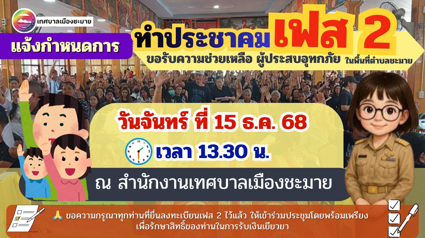 แจ้งเปิดรับลงทะเบียนขอรับความช่วยเหลือผู้ได้รับผลกระทบจากอุทกภัย ในพื้นที่ตำบลชะมาย ประจำปี 2568 เฟส2 |