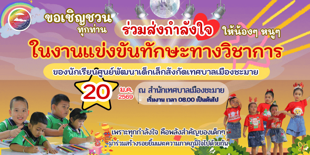 ร่วมส่งกำลังใจให้น้องๆ หนูๆ ในงานแข่งขันทักษะทางวิชาการ ของนักเรียนศูนย์พัฒนาเด็กเล็กสังกัดเทศบาลเมืองชะมาย ประจำปีงบประมาณ 2569 |
