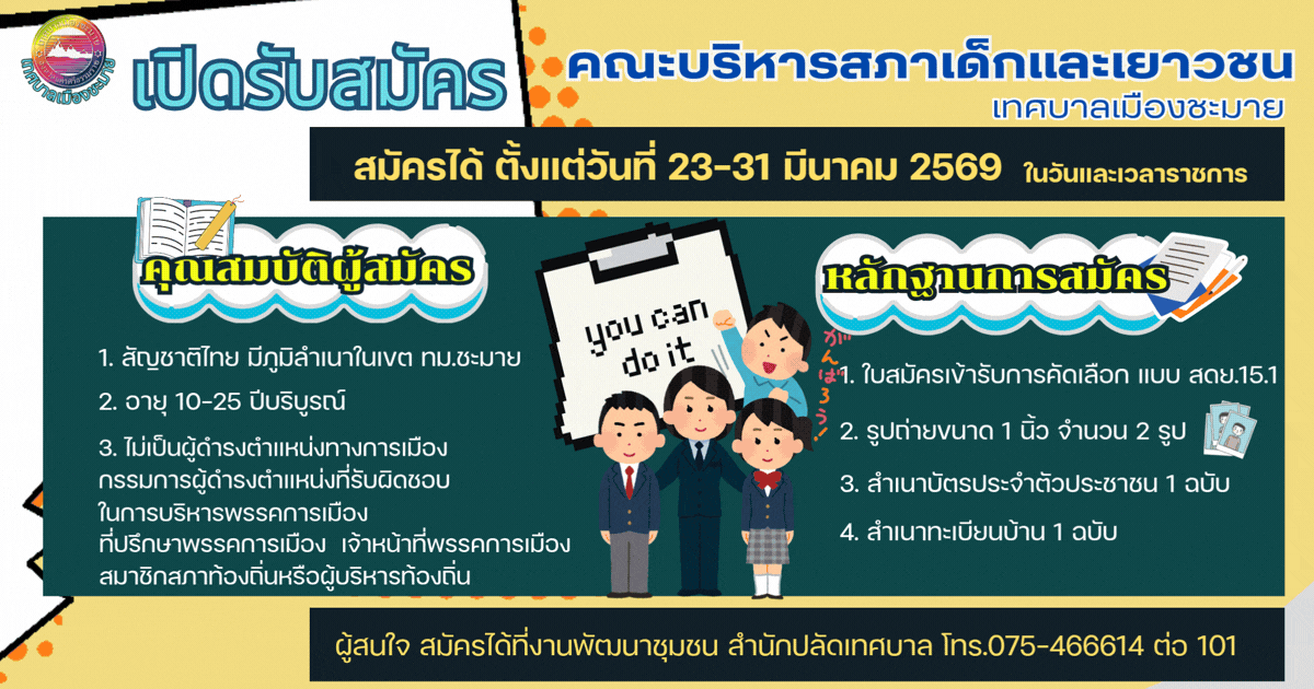 เปิดรับสมัครเด็กและเยาวชน เข้ารับการคัดเลือกเป็นคณะบริหารสภาเด็กและเยาวชนเทศบาลเมืองชะมาย |
