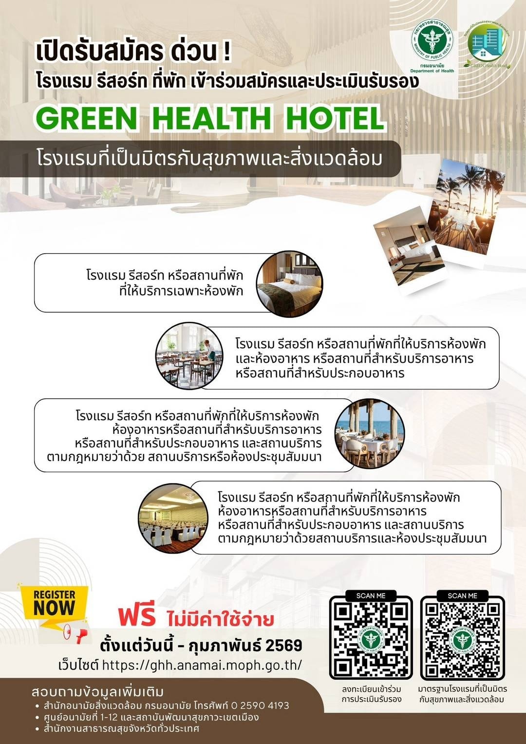 ขอเชิญโรงแรม และแหล่งท่องเที่ยว เข้ารับการประเมินมาตรฐานโรงแรมและแหล่งท่องเที่ยวที่เป็นมิตรกับสิ่งแวดล้อม |