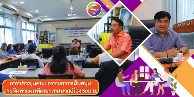 นายอรุณศักดิ์ ชูแก้ว ปลัดเทศบาลเมืองชะมาย ประธานการประชุมคณะกรรมการสนับสนุนการจัดทำแผนพัฒนาเทศบาลเมืองชะมาย พร้อมคณะกรรมการฯ