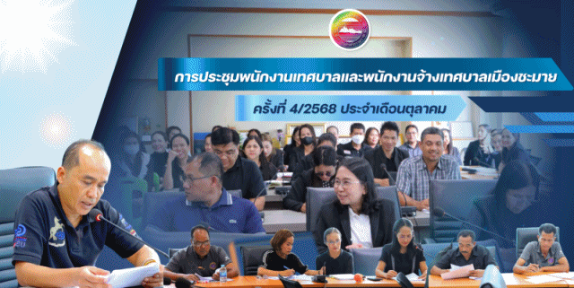 นายประพัฒน์ รักษ์ศรีทอง นายกเทศมนตรีเมืองชะมาย เป็นประธานในการประชุมพนักงานเทศบาลและพนักงานจ้างเทศบาลเมืองชะมาย ครั้งที่ 4/2568 ณ ห้องประชุมเทศบาลเมืองชะมาย