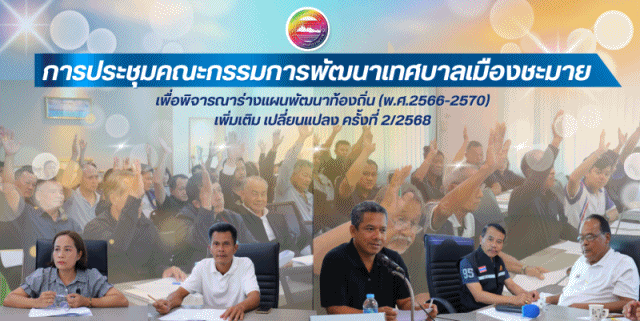 ดำเนินการประชุมคณะกรรมการพัฒนาเทศบาลเมืองชะมาย เพื่อพิจารณาร่างแผนพัฒนาท้องถิ่น (พ.ศ.2566-2570) เพิ่มเติม เปลี่ยนแปลง ครั้งที่ 2/2568 ณ ห้องประชุมเทศบาลเมืองชะมาย โดย มีคณะผู้บริหาร สมาชิกสภาเทศบาล คณะกรรมการพัฒนาเทศบาล ผู้แทนจากหน่วยงานภาครัฐ รัฐวิสาหกิจ ผู้แทนประชาคม หัวหน้าส่วนราชการ ผู้บริหารสถานศึกษา พนักงานเทศบาล และเจ้าหน้าที่ที่เกี่ยวข้องเข้าร่วมการประชุมฯ ในครั้งนี้ เพื่อร่วมกันพิจารณาร่างแผนพัฒนาท้องถิ่น (พ.ศ.2566-2570) เพิ่มเติม เปลี่ยนแปลง ครั้งที่ 2/2568 และพิจารณาให้ความเห็นชอบในการติดตั้งสัญญาณไฟจราจร (ไฟเขียว-ไฟแดง) แขวงทางหลวงชนบทนครศรีธรรมราช