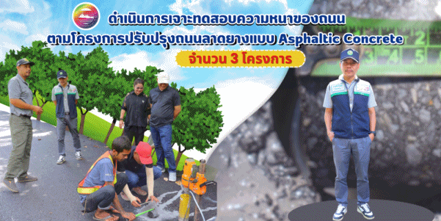 มอบหมายคณะกรรมการตรวจรับงานจ้าง นำโดยนายอรุณศักดิ์ ชูแก้ว ปลัดเทศบาล (ประธานกรรมการ), นายอนุสิทธิ์ ทิตทอง ผู้อำนวยการกองช่าง (กรรมการ), นายสิทธิพงษ์ ด้วงช่วย หัวหน้าฝ่ายบริหารงานทั่วไป(กรรมการ), พร้อมด้วยผู้ควบคุมงานร่วมดำเนินการทดสอบความหนาของถนนตามโครงการปรับปรุงถนนลาดยางแบบ Asphaltic Concrete จำนวน 3 สาย ดังนี้
