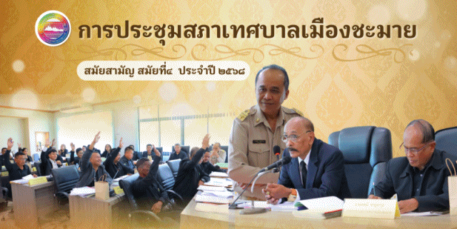 นายฉัตรพล วัชรคิรินทร์ ประธานสภาเทศบาลเมืองชะมาย เป็นประธานในการประชุมสภาเทศบาลเมืองชะมาย สมัยสามัญ สมัยที่ 4 ประจำปี พ.ศ.2568 ณ ห้องประชุมสภาเทศบาลเมืองชะมาย  โดยมีนายประพัฒน์ รักษ์ศรีทอง นายกเทศมนตรีเมืองชะมาย พร้อมด้วยคณะผู้บริหารฯ สมาชิกสภาเทศบาลเมืองชะมาย และหัวหน้าส่วนราชการ เข้าร่วมในการประชุมครั้งนี้   ภายใต้ระเบียบวาระการประชุม และญัตติ ดังต่อไปนี้