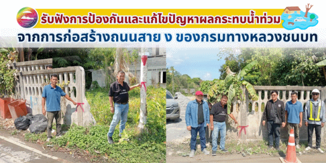 นายประพัฒน์ รักษ์ศรีทอง นายกเทศมนตรีเมืองชะมาย มอบหมาย นายชัยยุทธ หอมหวล รองนายก ทม.ชะมาย นายประสงค์ พรหมวันรัตน์ รองนายก ทม.ชะมาย พร้อมด้วย ผู้อำนวยการกองช่าง ร่วมกับ เจ้าหน้าที่สำนักงานทางหลวงชนบท ผู้รับผิดชอบโครงการก่อสร้างถนนสาย ง ผังเมืองรวมทุ่งสง เพื่อลงพื้นที่ รับฟังการชี้แจ้งแนวทางการแก้ไขปัญหาผลกระทบที่คาดว่าอาจจะเกิดน้ำท่วมขังหลังจากการก่อสร้างถนนสาย ง ผังเมืองรวมทุ่งสง ในพื้นที่หมู่ที่ 7 ตำบลชะมาย อำเภอทุ่งสง จังหวัดนครศรีธรรมราช