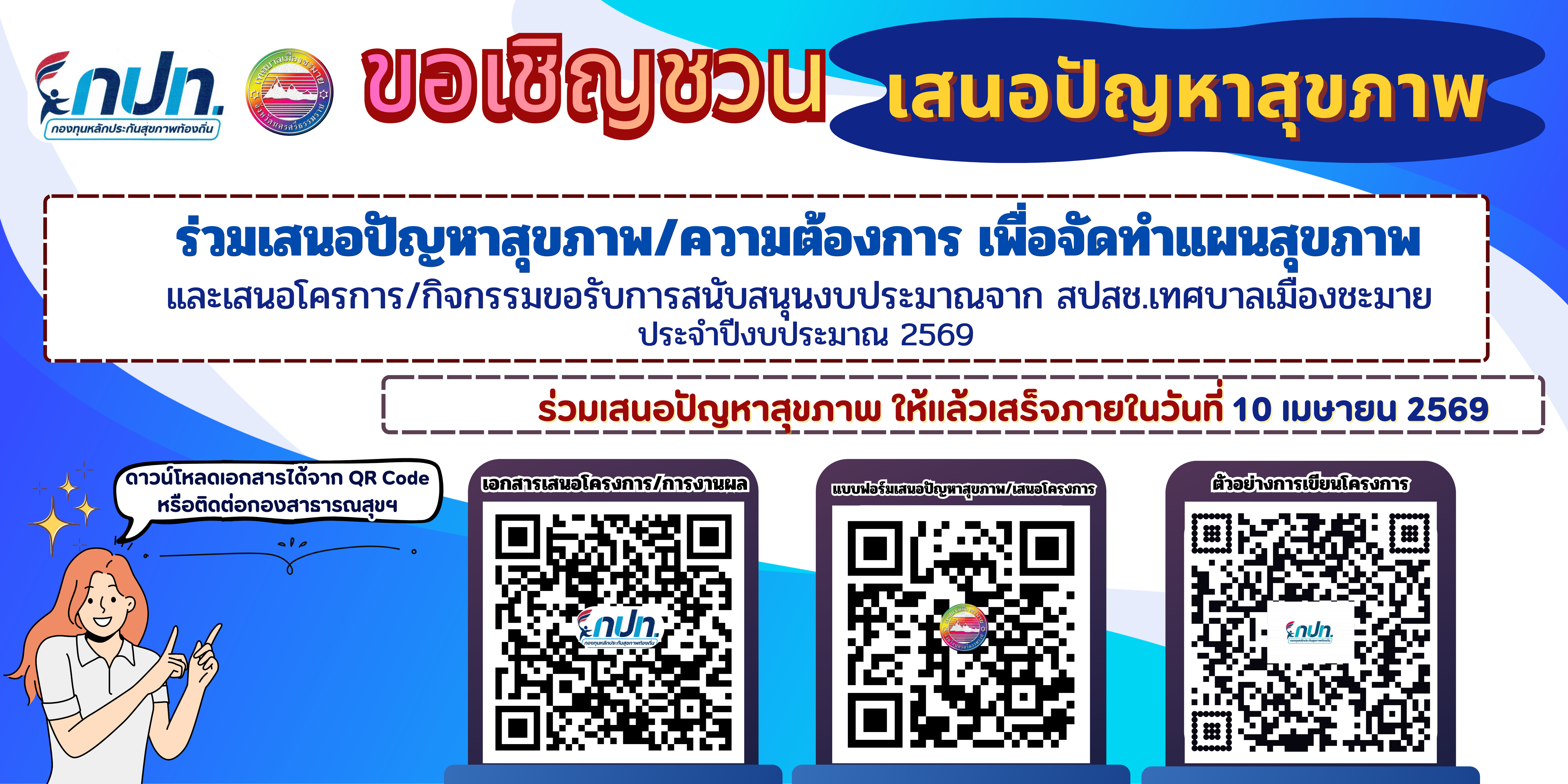ขอเชิญชวนร่วมเสนอปัญหาสุขภาพเพื่อจัดทำแผนสุขภาพ และเสนอโครการ/กิจกรรมขอรับการสนับสนุนงบประมาณจาก สปสช.เทศบาลเมืองชะมาย ประจำปีงบประมาณ 2569 |