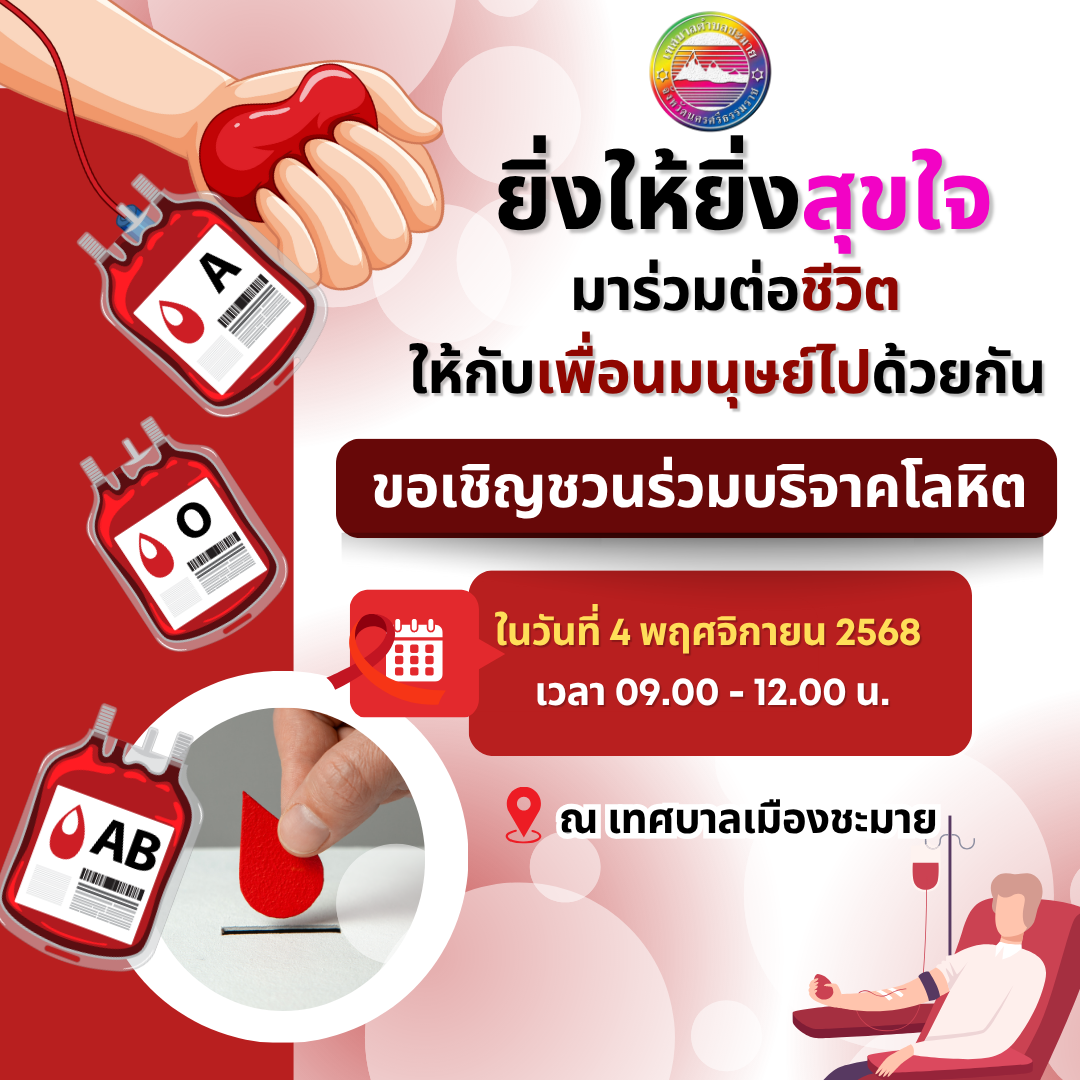 ขอเชิญชวนร่วมบริจาคโลหิต ณ สำนักงานเทศบาลเมืองชะมาย |