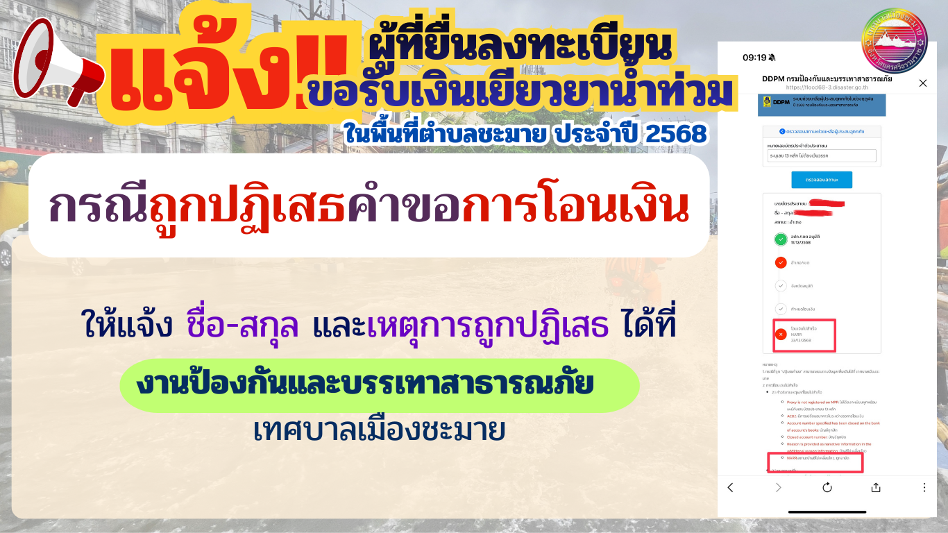 แจ้งผู้ที่ยื่นลงทะเบียนขอรับเงินเยียวยาน้ำท่วม ในพื้นที่ตำบลชะมาย ประจำปี 2568 กรณีถูกปฏิเสธคำขอการโอนเงิน |