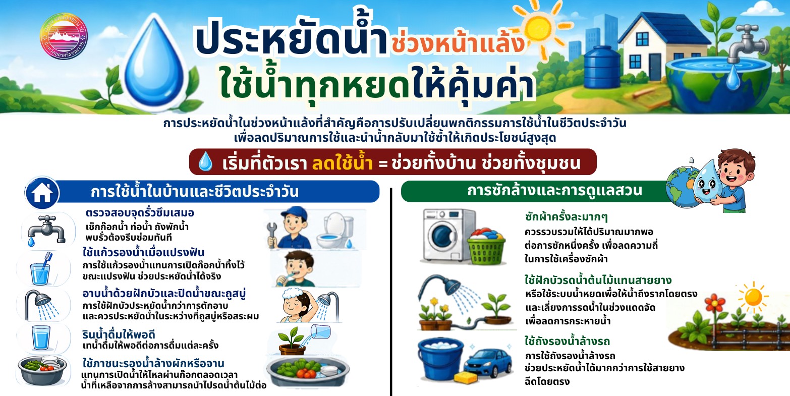 แล้งนี้ร่วมใจกันประหยัดน้ำ โดยใช้น้ำทุกหยดให้คุ้มค่า ช่วยทั้งบ้าน ช่วยทั้งชุมชน |